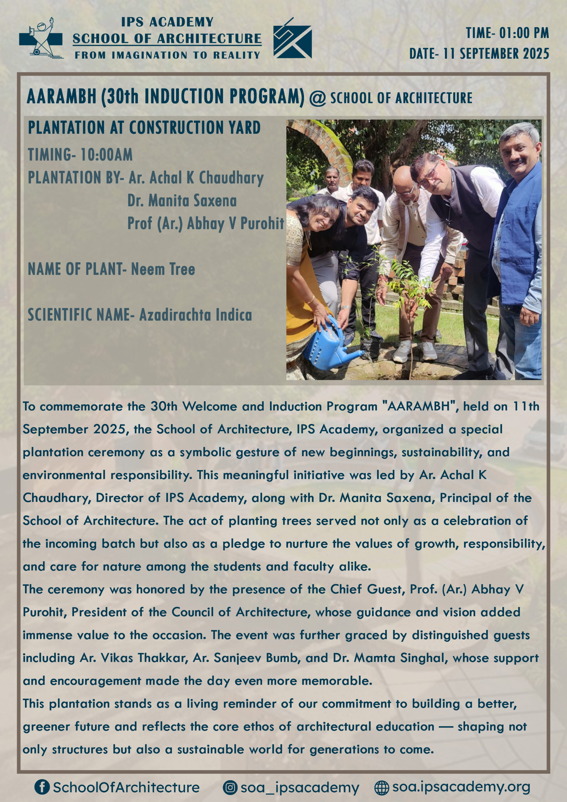 At the School of Architecture, IPS Academy, Indore, we believe that every meaningful event should leave a lasting, living impact. To honor this philosophy, SOA has nurtured a unique tradition: planting a tree to commemorate significant occasions, academic milestones, and dignitary visits. As part of this tradition, a sapling is first planted in a designated plantation pit